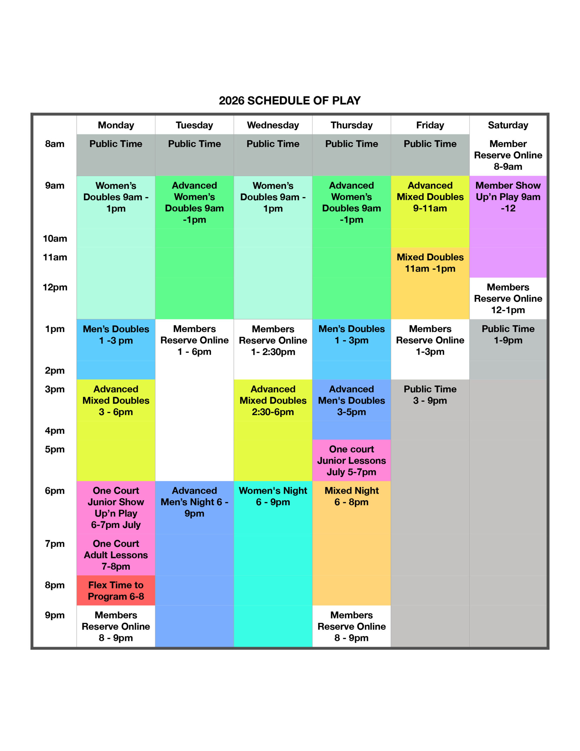 Players must sign up in advance for Women’s Doubles, Men’s Doubles, Mixed Doubles, Advanced Women’s Doubles, Advanced Men’s Doubles & Advanced Mixed Doubles & Evening Leagues. (See League page).